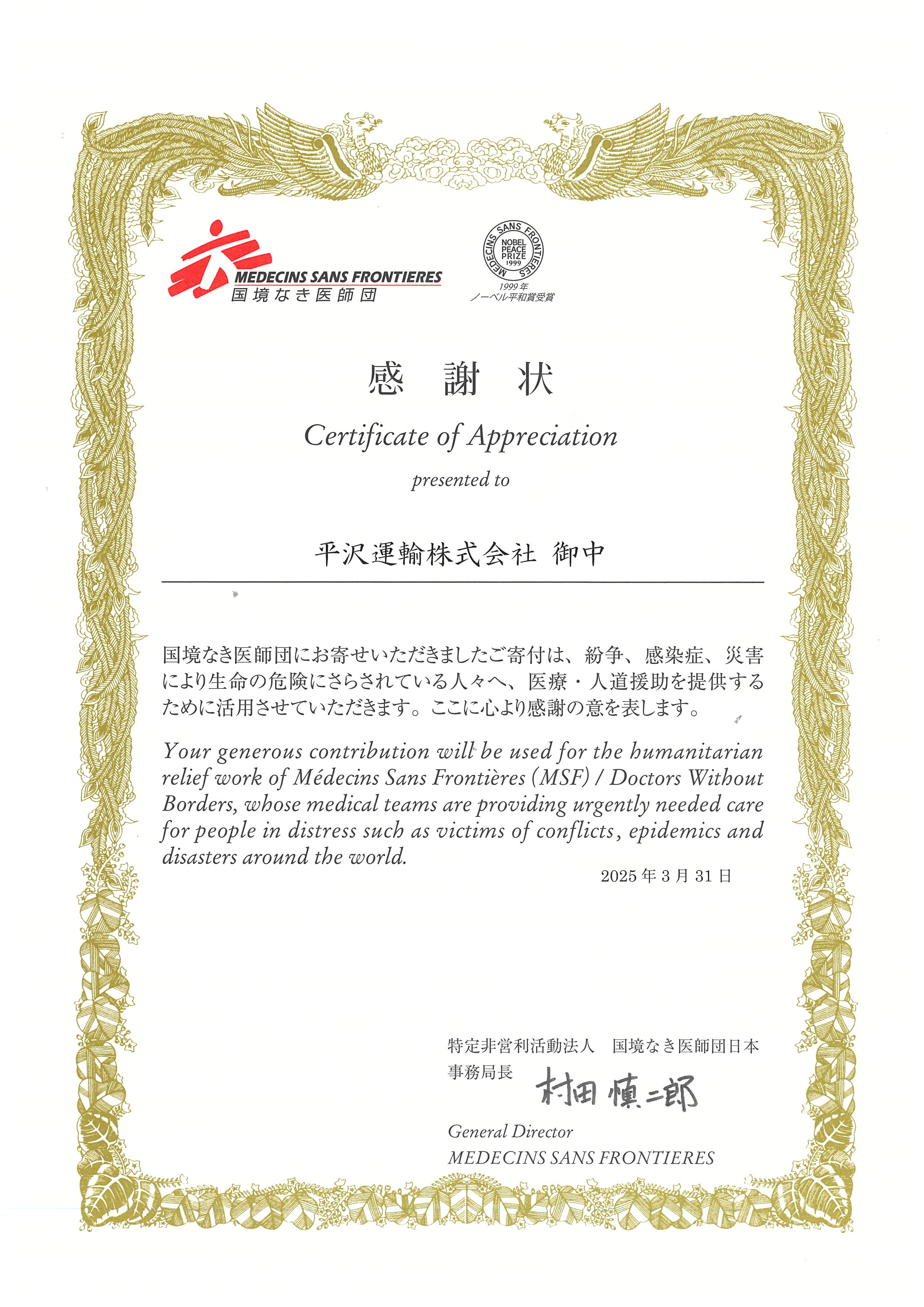 国境なき医師団への支援について 平沢運輸株式会社は、国境なき医師団(MSF)に対して 寄付を行いました。 【支援の目的】 当社は紛争や被災などで危機に瀕する人々に対し、現金給付・医療援助を 通じて世界全体の資源の安定的な確保を緊急医療援助に貢献したいと 考えております。 ※国境なき医師団(MSF)は、民間で非営利の医療・人道援助団体です。 紛争や自然災害、貧困などにより危機に直面する人々に、 独立・中立・公平な立場で緊急医療援助を届けています。また、医療援助 と同時に、現地で目の当たりにした人道危機を社会に訴える「証言活動」も 国境なき医師団の使命です。 当社およびその従業員は、惨禍に見舞われた方々が一刻も早く平和な生活を 取り戻すことを心より願っております。 ![]() |
